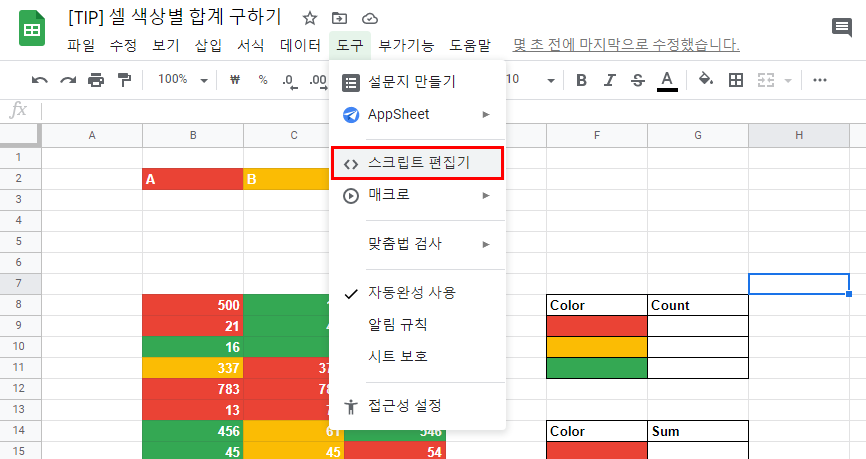 [스프레드시트] 섹상별 개수 구하기 (Script 활용 - SumColor)