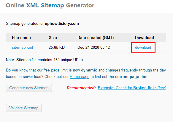 모두 생성이 되었다면, 다운로드를 눌러주세요. 해당 파일을 웹사이트나 블로그에 업로드하여, 첨부파일 주소를 검색 최적화 사이트 (네이버, 구글 등)에 제출해주세요. 그러면 좀 더 빠르고, 누락없이 검색어 등록이 편할 거에요 :D